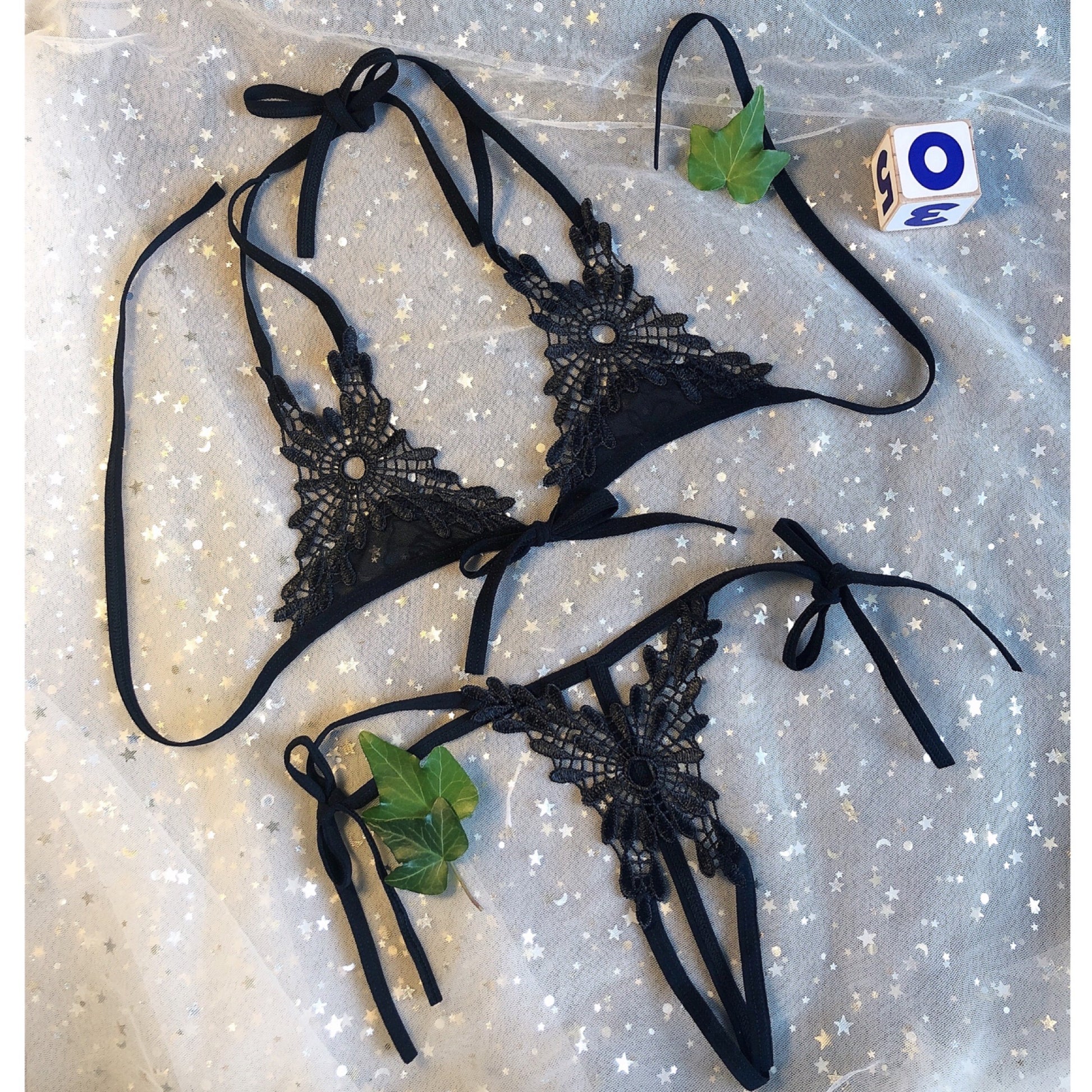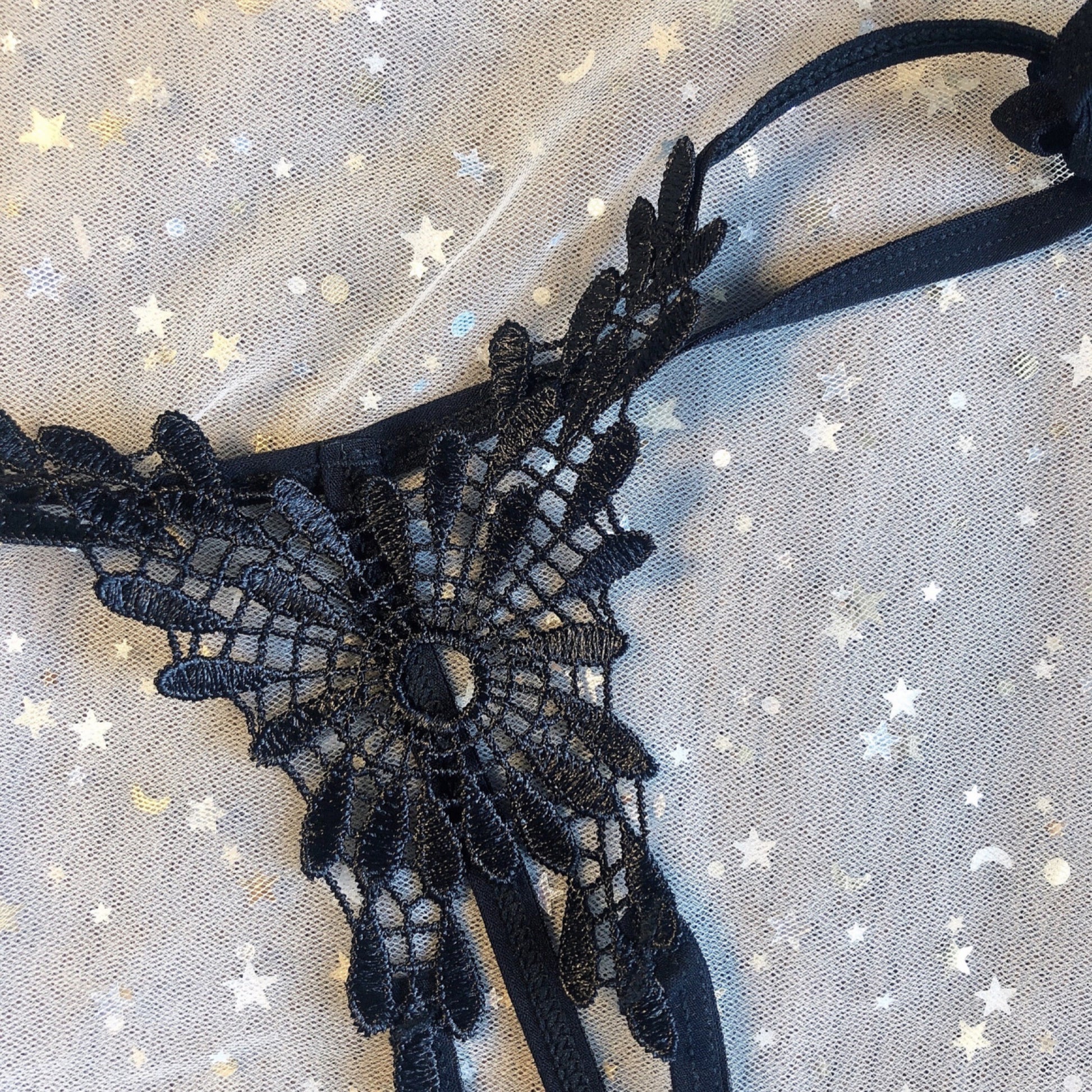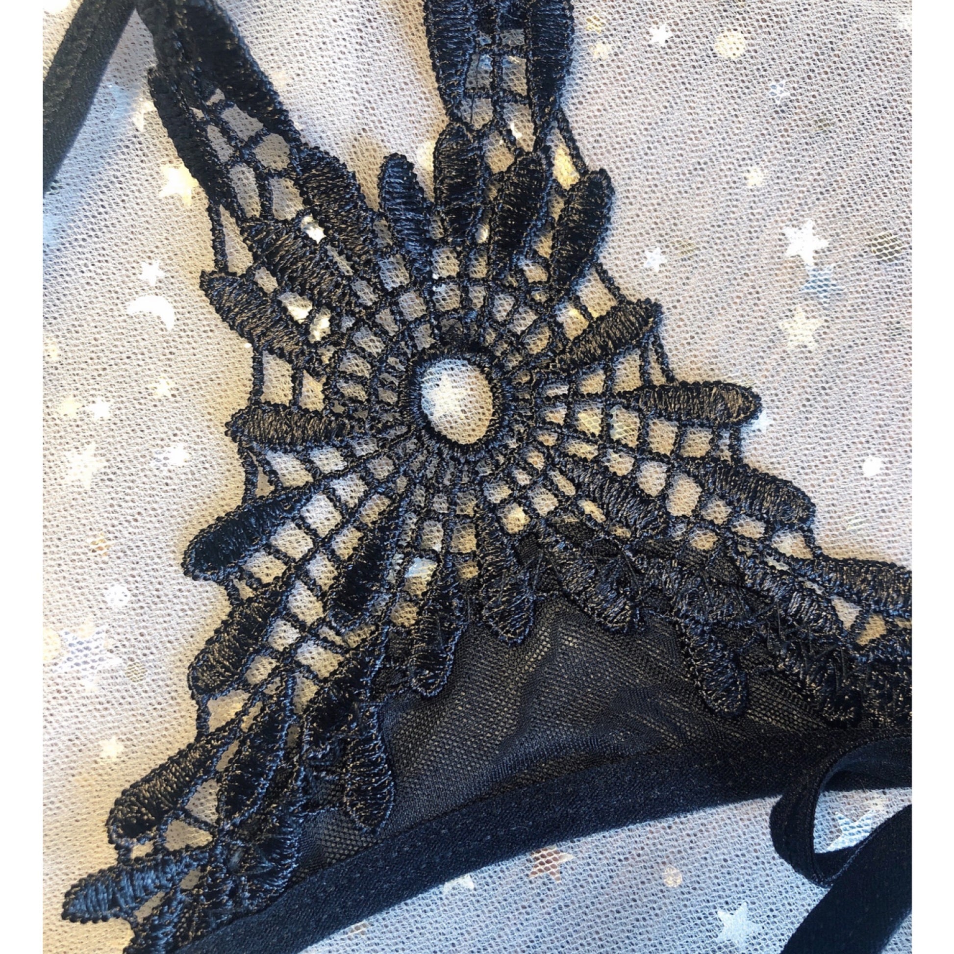 This black lace lingerie set combines delicate floral patterns with seductive functionality. Featuring front-open cups and a crotchless panty, it ties at every angle—ready to tease, reveal, and entice.