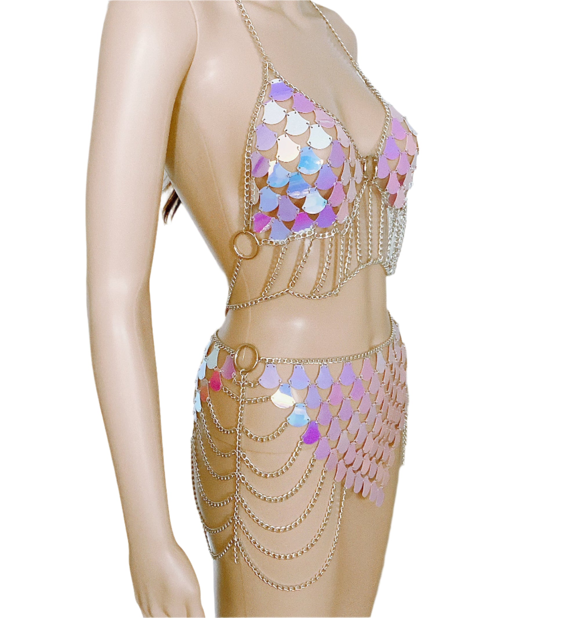 Turn heads and own the spotlight in this iridescent chainmail bikini set. Designed with shimmering rainbow scale sequins and silver chains, it’s the ultimate look for festivals, pole dance, or bold bedroom moments.