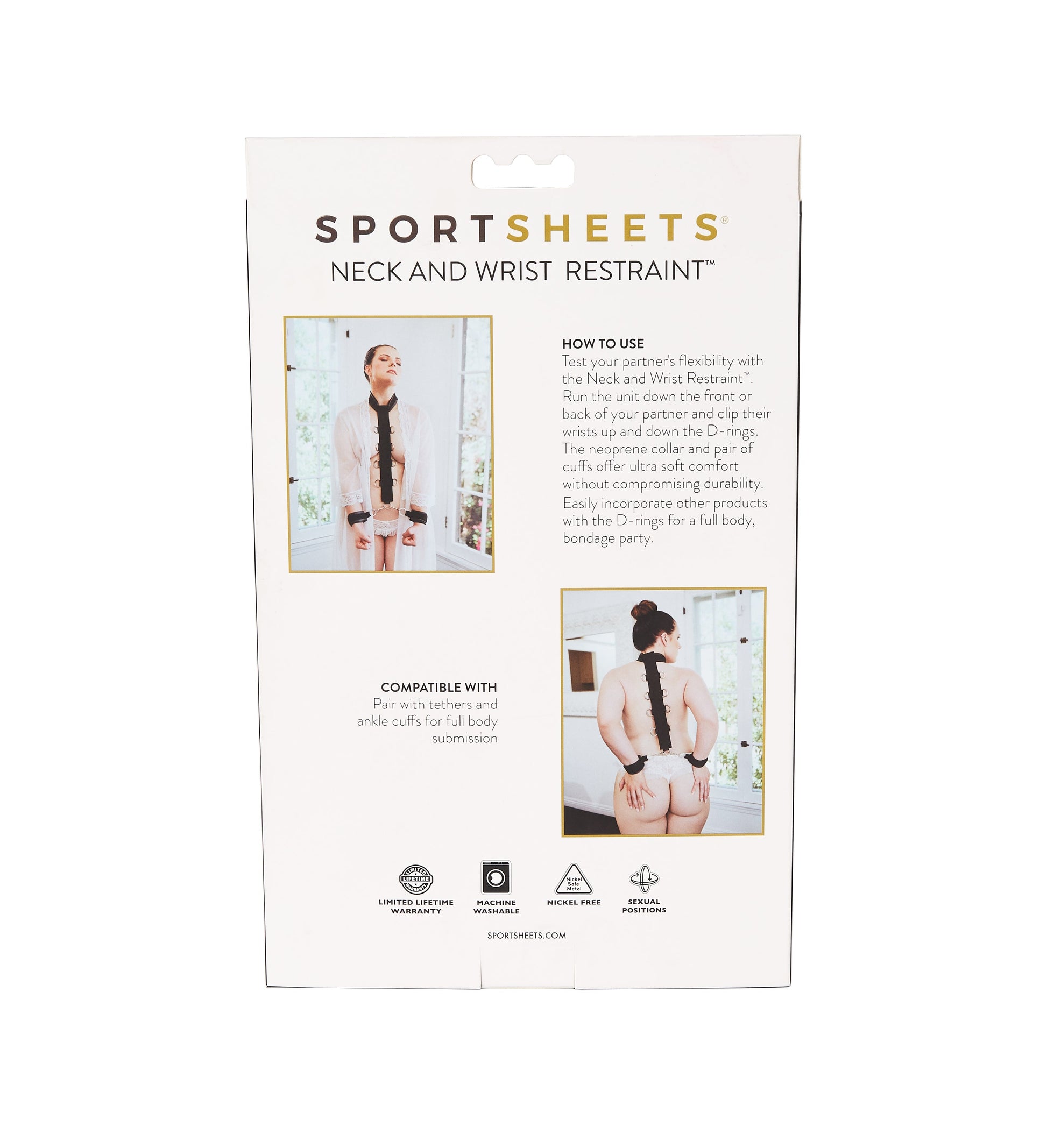 Turn your fantasies into reality with the Sportsheets Neck and Wrist Restraint—a versatile bondage system designed for front or back restraint play. Featuring a soft neoprene collar, four metal D-rings, and adjustable hook & loop cuffs, this all-in-one setup allows you to explore full-body submission with total comfort and customizable positioning.