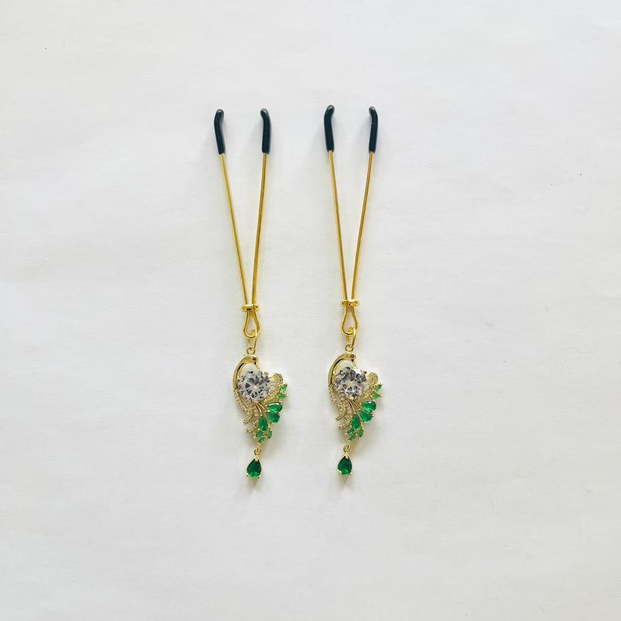 Peacock Crystal Nipple Clamps – Emerald Elegance with Teardrop Detail