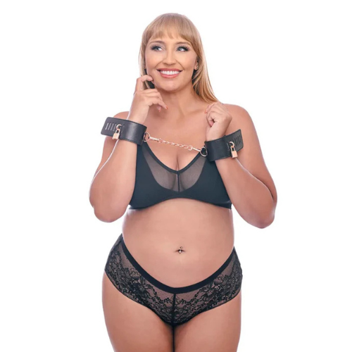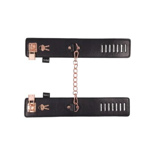 Discover the perfect blend of restraint and style with the Brat Locking Cuffs by Sportsheets. Crafted from durable vegan leather and finished with rose gold locks and chain, these adjustable cuffs are ideal for teasing, punishment, and obedience play.